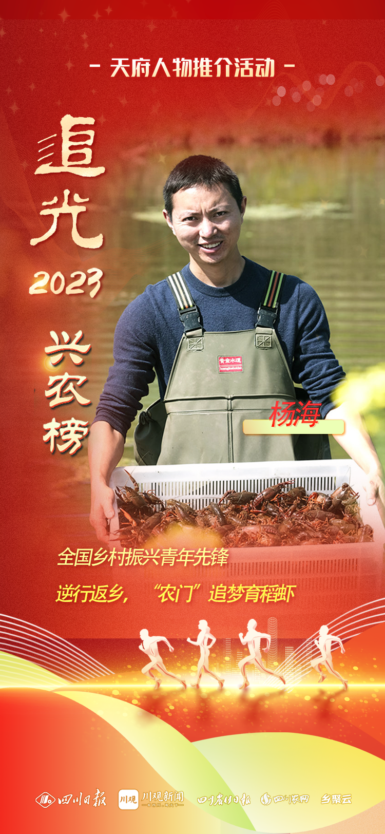 杨海,2014年从四川农业大学水产养殖专业毕业后,毅然选择返乡创业,从事稻虾养殖。现如今,通过合作社、协会等形式直接或间接带动1000余名农户从事稻虾养殖,助农增收。2022年荣获团中央颁布“全国乡村振兴青年先锋”,2023年荣获全国高校毕业基层就业卓越奖和神内基金农技推广奖,并当选为四川省第十四届人大代表。