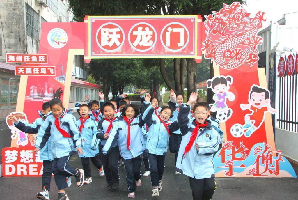 2月26日,南宁市华衡小学学生在开学仪式上“鱼跃龙门”,开启新学期。