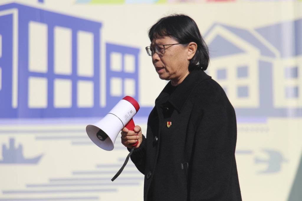 2月26日,张桂梅在云南丽江华坪女子高中校园里带领学生进行课间活动。
