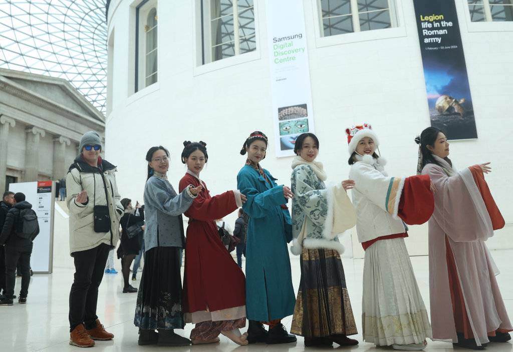 当日,汉服爱好者身着汉服来到英国伦敦的泰晤士河畔和大英博物馆,向当地民众和游客介绍中国春节,宣传中华传统文化。