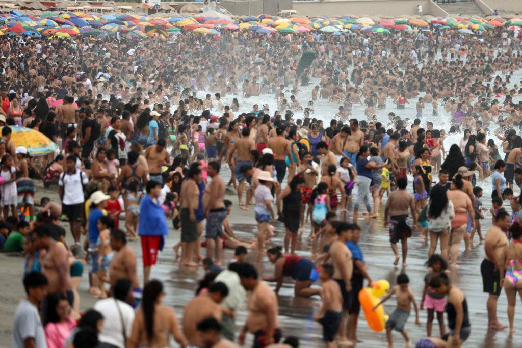 2月25日,人们在秘鲁利马的一处海滩纳凉玩耍。