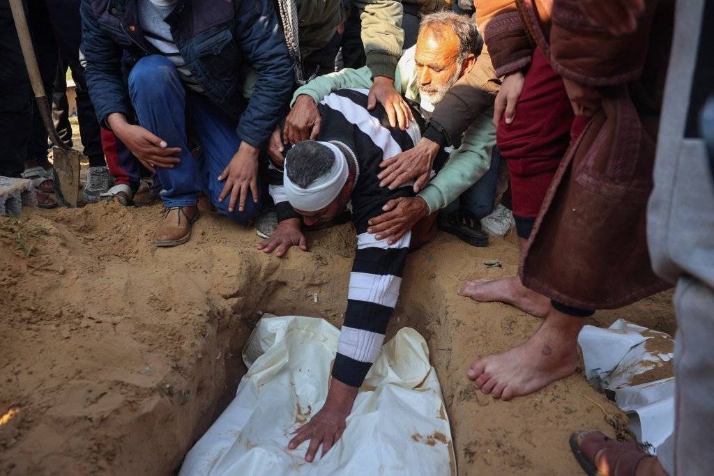 2月26日,人们在加沙地带南部城市汗尤尼斯埋葬遇难者。