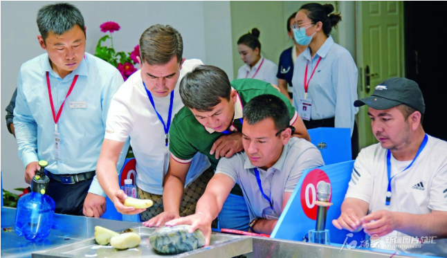 “交易中心有1800个玉石摊位,每个摊位上都有各种和田玉石,从低端到高端、从原石到成品在这里都能找到。”新疆和田玉石交易中心办公室主任朱勇介绍,以前,和田玉石交易一直没有正规渠道,大多是用私下交易的方式,交易风险高,也制约着玉石行业的产业化发展。成立新疆和田玉石交易中心以来,玉石交易市场更规范了。此外,去年6月开启了和田玉籽料公盘交易,作为和田地区规范玉石市场的重要举措,截至2023年底,公盘交易金额达5000余万元,贡献税收100余万元。