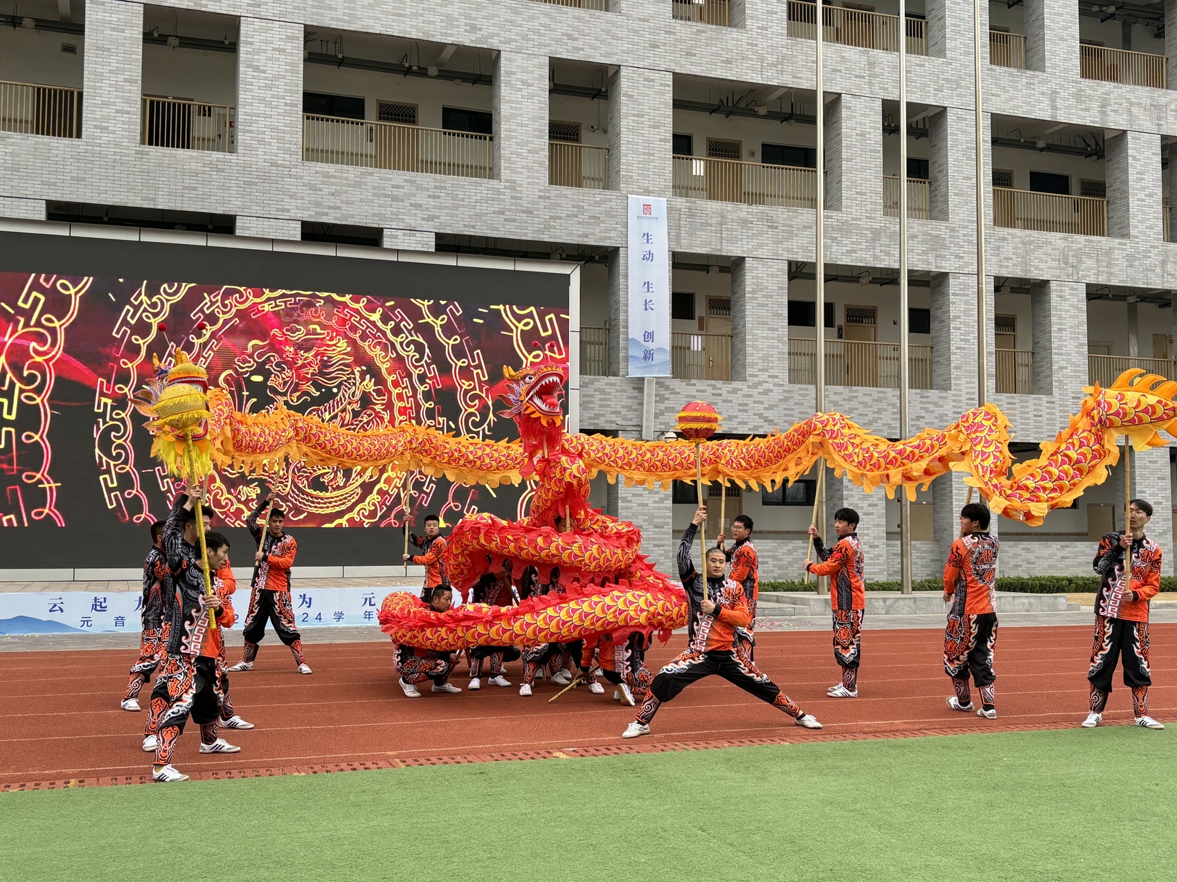 四川天府新区元音中学的舞龙表演。