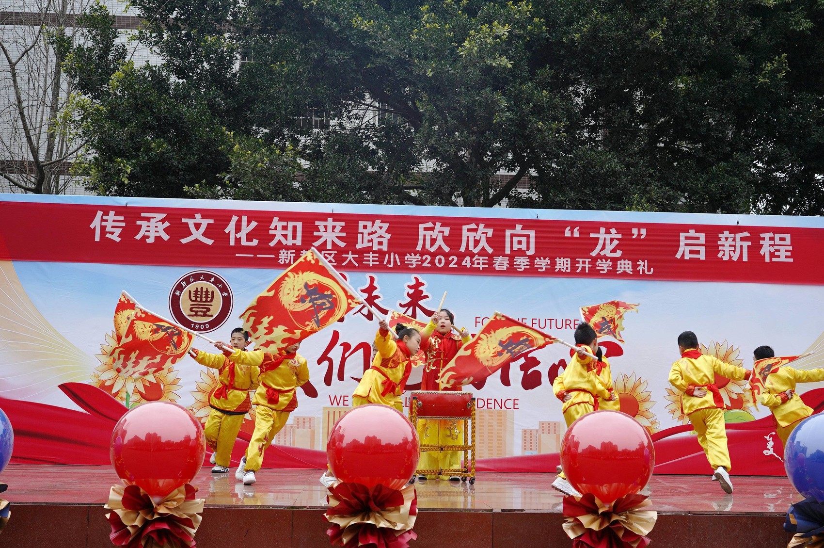 新都区大丰小学校开学典礼上的舞蹈表演《中国龙》。