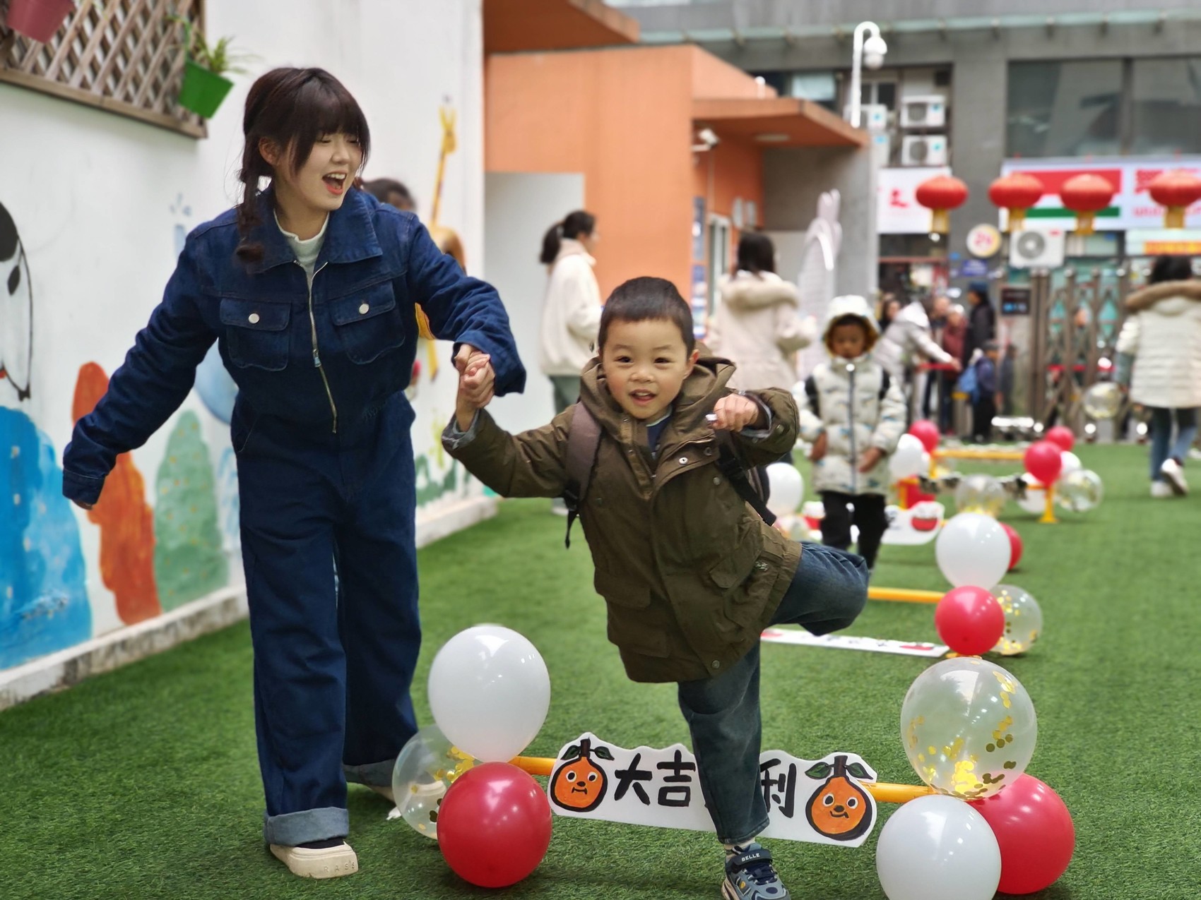 成都市第二幼儿园督院园区的宝贝们在老师的带领下跨“龙门”。