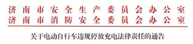 2月26日,济南市安全生产委员会办公室、济南市消防安全委员会办公室联合发布《关于电动自行车违规停放充电法律责任的通告》——