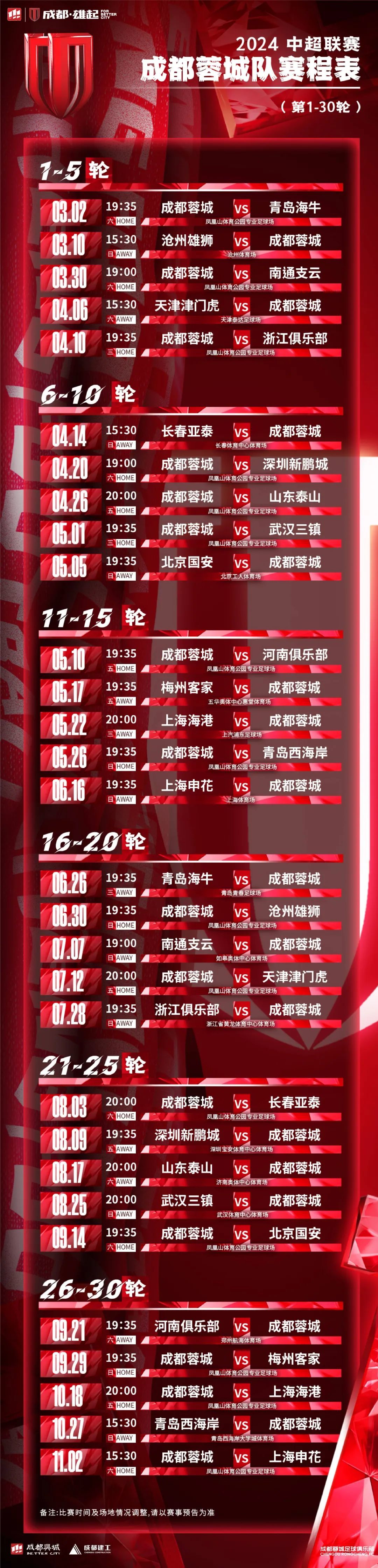 成都蓉城2024赛季中超联赛专属赛程表请查收