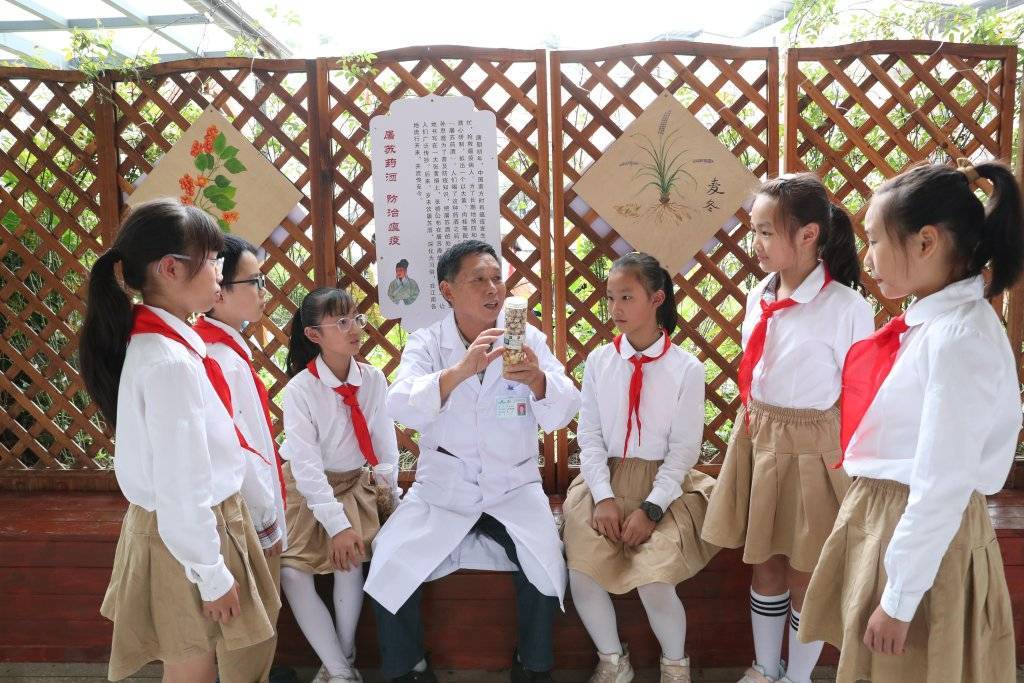 广安市广安区富源小学中药文化长廊,学生们在广安福源医院中医专科医师袁术益的指导下认识中药材。廖小兵 摄