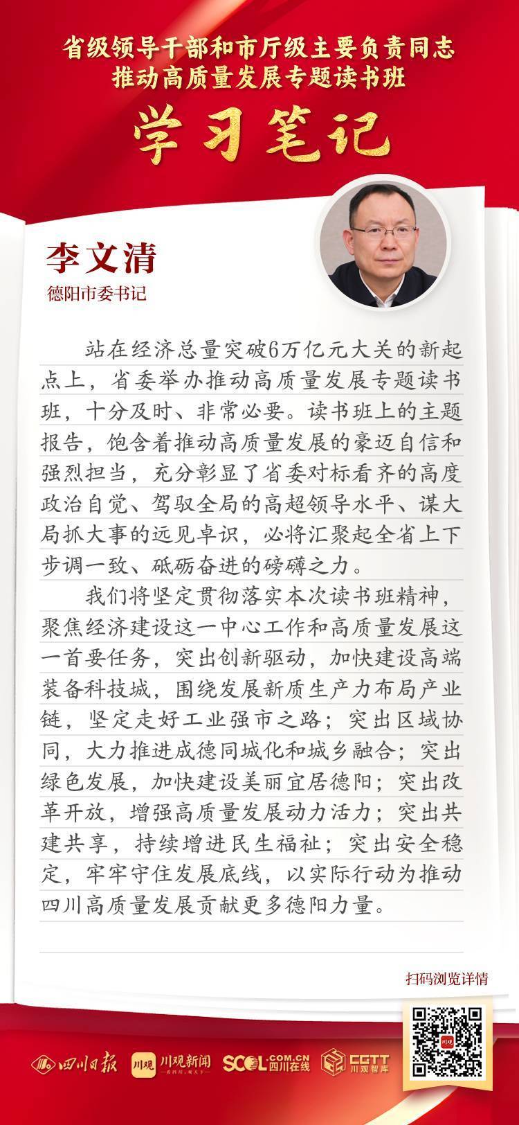 我们将坚定贯彻落实本次读书班精神,聚焦经济建设这一中心工作和高质量发展这一首要任务,突出创新驱动,加快建设高端装备科技城,围绕发展新质生产力布局产业链,坚定走好工业强市之路;突出区域协同,大力推进成德同城化和城乡融合;突出绿色发展,加快建设美丽宜居德阳;突出改革开放,增强高质量发展动力活力;突出共建共享,持续增进民生福祉;突出安全稳定,牢牢守住发展底线,以实际行动为推动四川高质量发展贡献更多德阳力量。