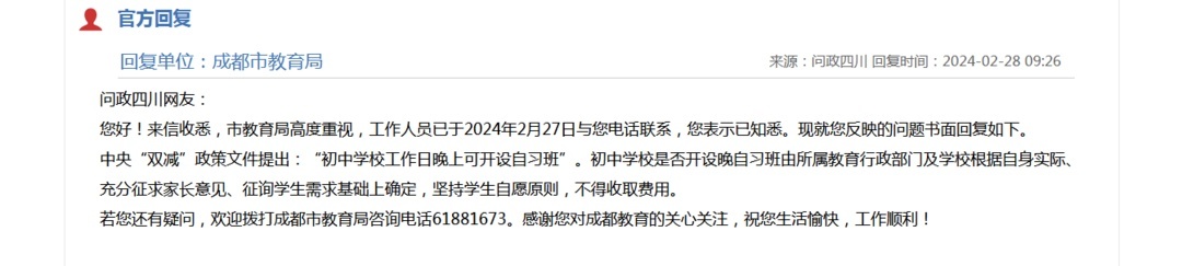 2月28日,成都市教育局在问政平台答复网友时表示,中央“双减”政策文件提出:“初中学校工作日晚上可开设自习班”。