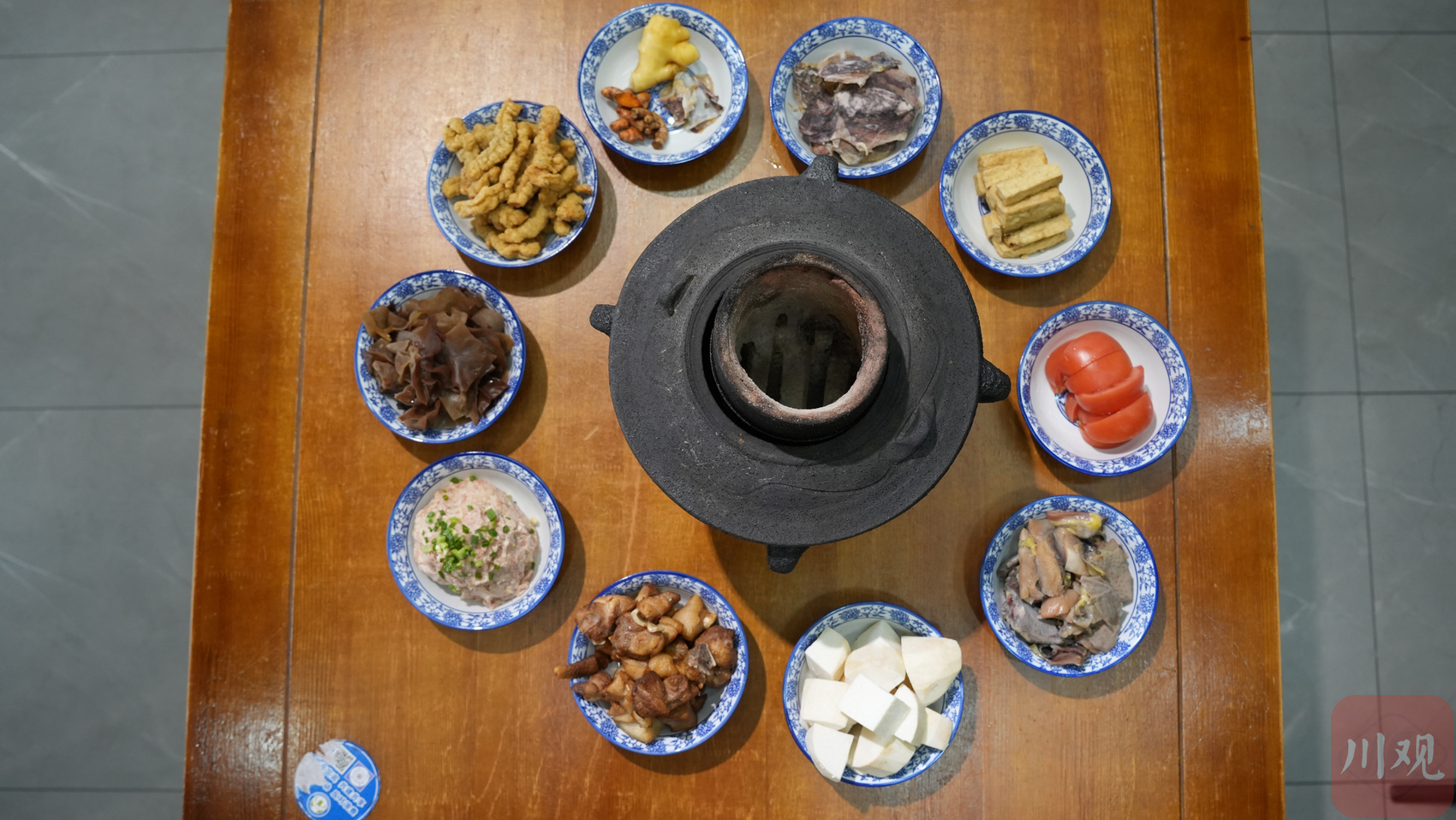 烹制土火锅的食材非常丰富,有土鸡、尖刀圆子、干鱿鱼、炸猪蹄、鲜笋、木耳、香芋、玉兰片、豆腐、酥肉、豆筋、豆腐、番茄等。