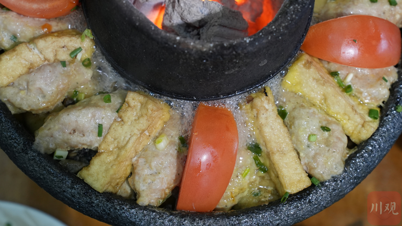 煮好后还有最后一个关键环节——在最上一层交错摆上豆腐和尖刀圆子,煮熟后,间隔下入番茄瓣,撒上葱花。这一层的摆法最有特色,无论是尖刀圆子与鹌鹑蛋、圣女果、羊肚菌的组合,还是与豆腐、番茄的组合,都是交错开来,鲜艳而分明。