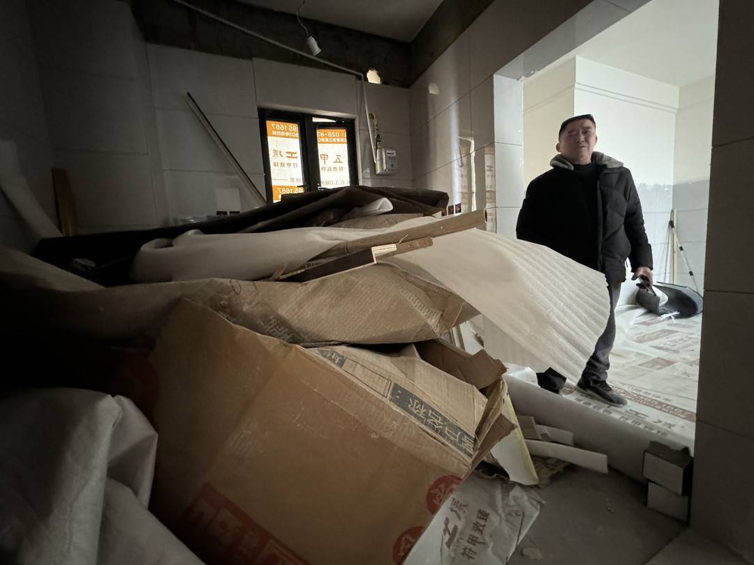 2月27日,记者来到梁女士的新房施工现场,她老公吴先生正对着一片狼藉的房子走神,角落里堆满了建材废渣和还没用完的石膏,不知该如何处理。