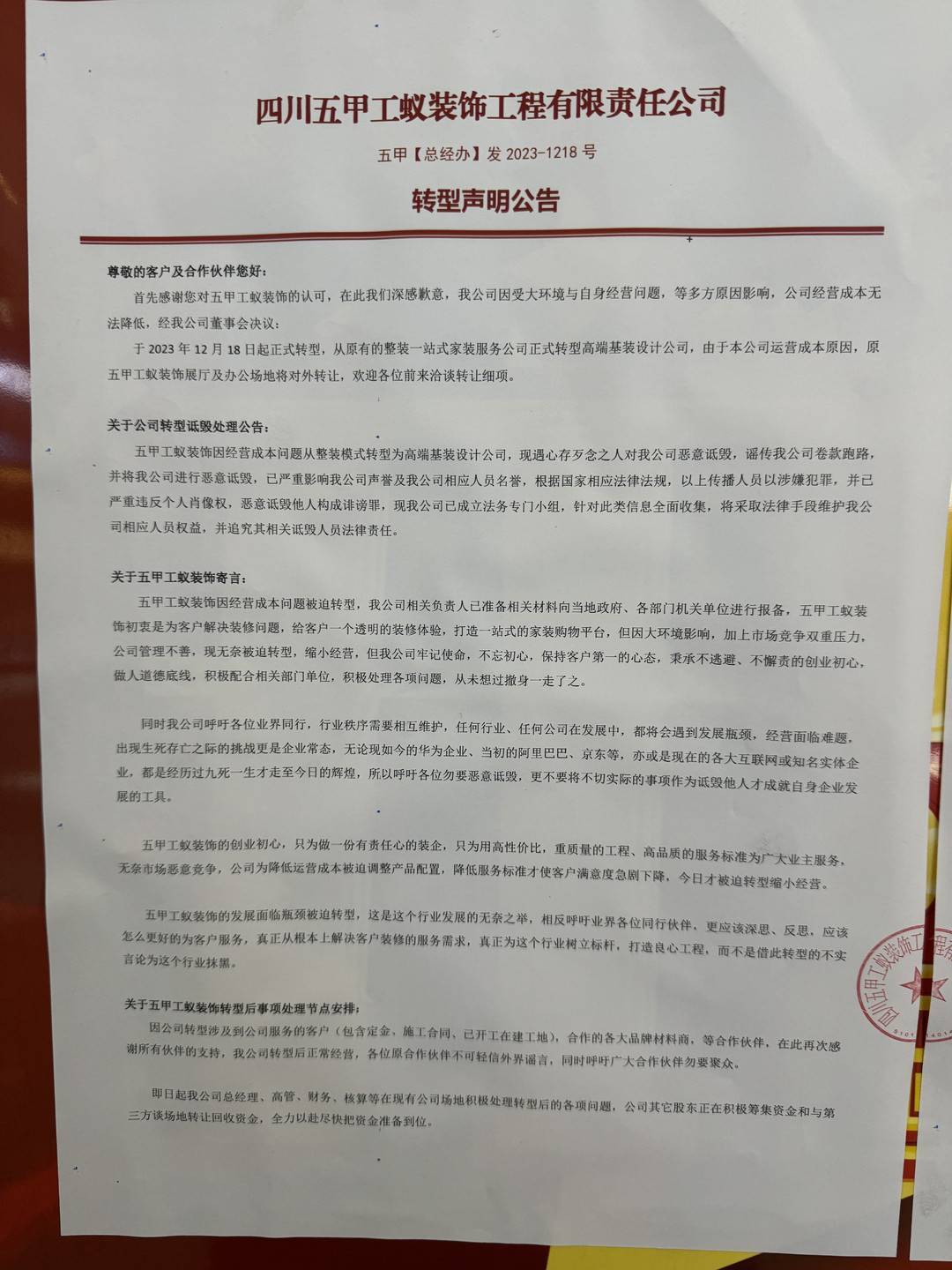 在展厅门上,贴了一份该公司的转型声明。声明于2023年12月18日发出。其中提到:公司因大环境和自身经营问题,将整装一站式家装公司正式转型为高端基装设计公司,原来的装饰展厅及办公室场所将对外转让,公司卷款跑路为谣言,是对公司的恶意诋毁,将追究相关人员的法律责任。