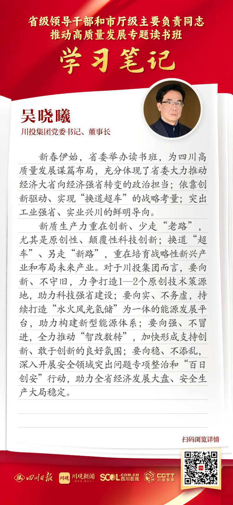 新质生产力重在创新、少走“老路”,尤其是原创性、颠覆性科技创新;换道“超车”、另走“新路”,重在培育战略性新兴产业和布局未来产业。对于川投集团而言,要向新、不守旧,力争打造1—2个原创技术策源地,助力科技强省建设;要向实、不务虚,持续打造“水火风光氢储”为一体的能源发展平台,助力构建新型能源体系;要向强、不冒进,全力推动“智改数转”,加快形成支持创新、敢于创新的良好氛围;要向稳、不添乱,深入开展安全领域突出问题专项整治和“百日创安”行动,助力全省经济发展大盘、安全生产大局稳定。