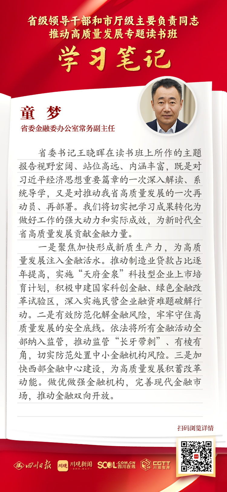 省委书记王晓晖在读书班上所作的主题报告视野宏阔、站位高远、内涵丰富,既是对习近平经济思想重要篇章的一次深入解读、系统导学,又是对推动我省高质量发展的一次再动员、再部署。我们将切实把学习成果转化为做好工作的强大动力和实际成效,为新时代全省高质量发展贡献金融力量。