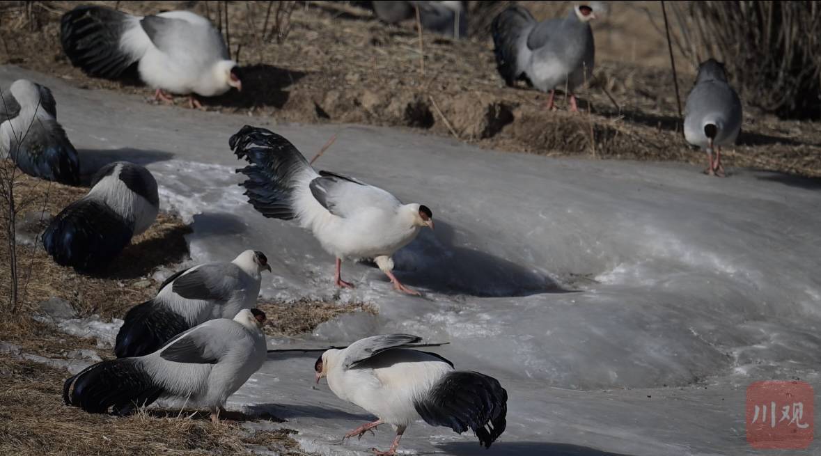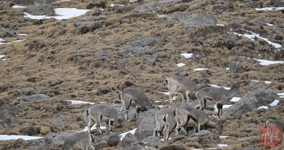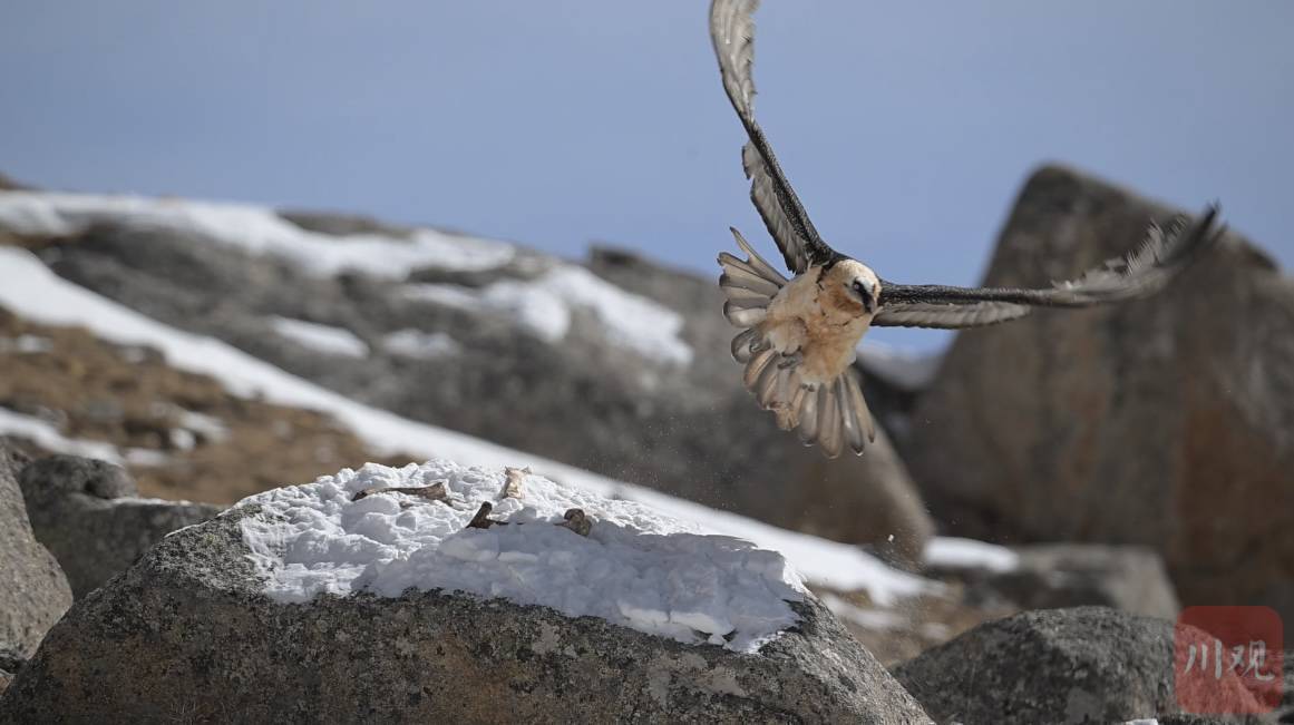 2月29日,在位于阿坝州阿坝县的莲宝叶则景区里,蓝天奇石,冰雪覆盖,岩羊、胡兀鹫、白马鸡等多种野生珍惜动物展翅、踱步、觅食,一派热闹的场景。