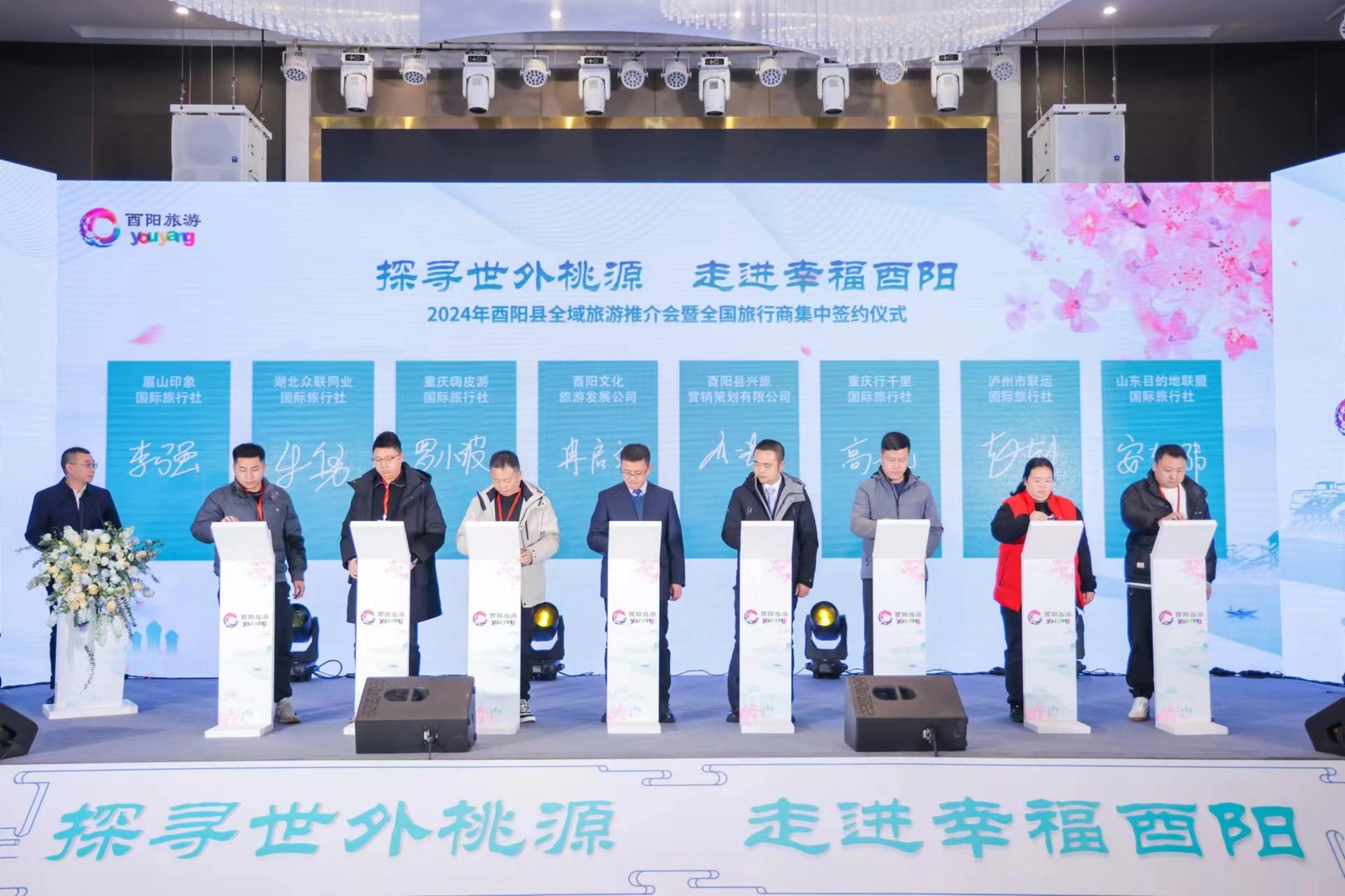 2月29日,由重庆市文化和旅游发展委员会、酉阳土家族苗族自治县人民政府主办,酉阳土家族苗族自治县文化和旅游发展委员会、桃花源旅投集团承办的“2024年酉阳县全域旅游推介会暨全国旅行商集中签约活动”在重庆市酉阳土家族苗族自治县举行。来自全国20余个省市自治区的旅行商、OTA平台、各旅行社、主流媒体等200余名代表参加活动。