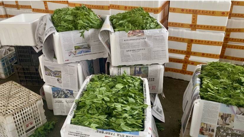 正在等候封箱,即将发往北京、新疆的豌豆尖。