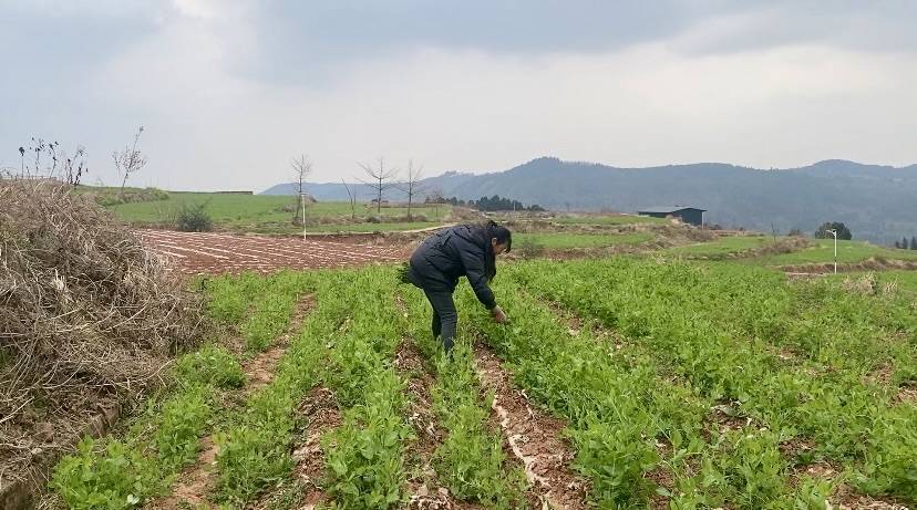 村民冉金华正在地里掐豌豆尖。