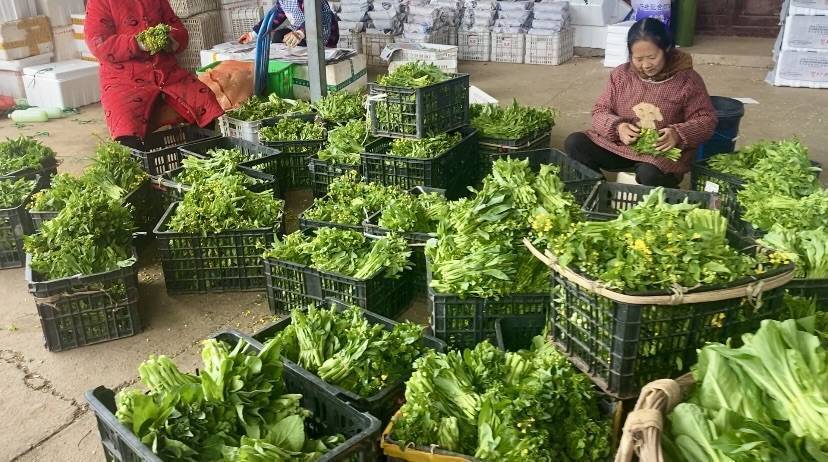 除了摆放整齐的豌豆尖泡沫箱,打包中心里一筐筐正在分拣称重的菜薹也吸引了记者注意。“像这种刚起苞,还没开花的菜薹是品质最好的。”村民冉金华随手拿起一把白菜薹说,“去年全村种了一百多亩菜薹,最近集中上市,一天能采5千多斤,收购价在1-2块钱之间。”