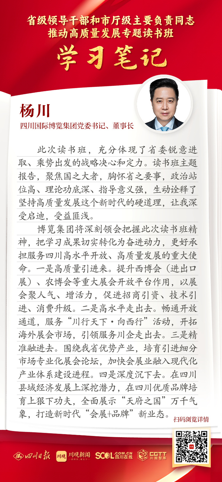 博览集团将深刻领会把握此次读书班精神,把学习成果切实转化为奋进动力,更好承担服务四川高水平开放、高质量发展的重大使命。一是高质量引进来。提升西博会(进出口展)、农博会等重大展会开放平台作用,以展会聚人气、增活力,促进招商引资、技术引进、消费升级。二是高水平走出去。畅通开放通道,服务“川行天下·向西行”活动,开拓海外展会市场,引领服务川企走出去。三是精准融进去。围绕我省优势产业,培育引进细分市场专业化展会论坛,加快会展业融入现代化产业体系建设进程。四是深度沉下去。在四川县域经济发展上深挖潜力,在四川优质品牌培育上狠下功夫,全面展示“天府之国”万千气象,打造新时代“会展+品牌”新业态。