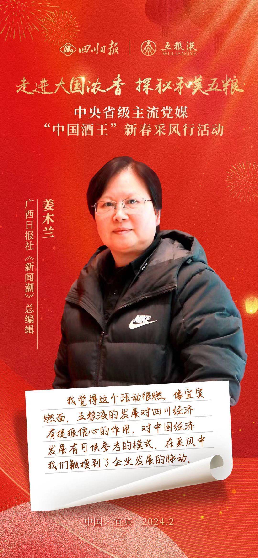 来自广西日报社《新闻潮》总编辑姜木兰在座谈会上的分享也说出了参会嘉宾共同的感受,“我觉得这个活动很‘燃’,我们看到了传承、发展、创新、突破,我们触摸到了企业发展的脉动。五粮液的发展对四川经济有提振信心的作用,对中国经济发展有可供参考的模式。”