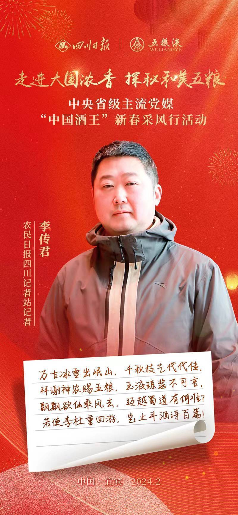 2月26日-27日,由四川日报全媒体、五粮液公司联合主办的中央省级主流党媒“中国酒王”新春采风行活动在酒都宜宾圆满举行。活动期间,30余家中央和省级主流党媒的优秀编辑、记者以及来自文化、经济、传媒界的知名专家一起走进五粮液,开启“从一粒种子到一滴美酒”的和美探秘之旅。