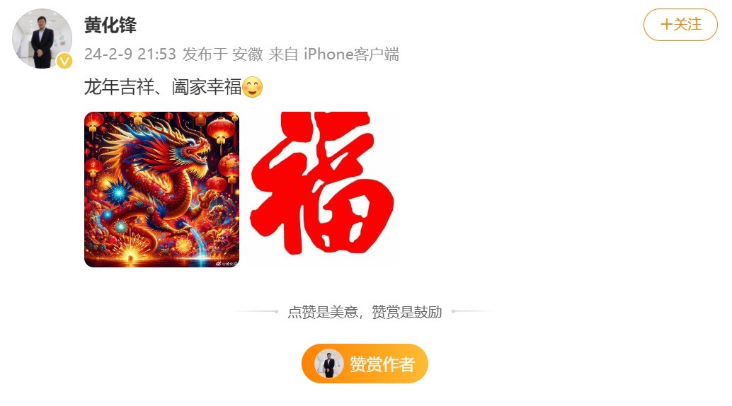 2024年2月9日,也就是此番通报被查三周前,黄化锋个人微博还发布了拜年消息称“龙年吉祥、阖家幸福”。