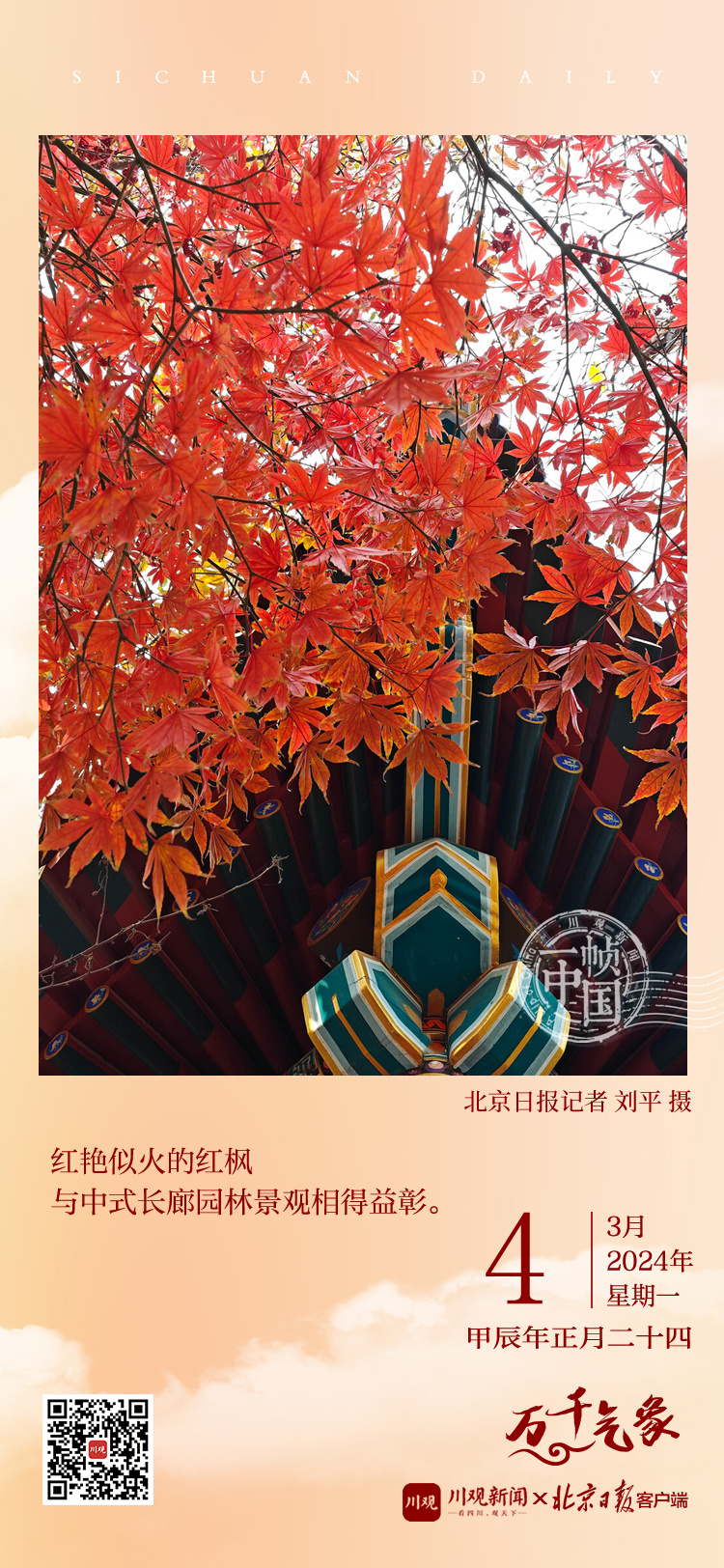 今天的《一帧中国》,川观新闻联合北京日报客户端,带您来到北京,图览红艳似火的红枫与中式长廊园林景观相得益彰的美景。