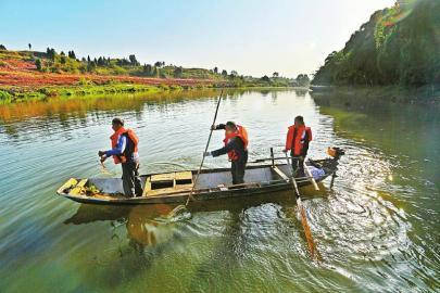 遂宁市安居区三家镇明星村的巡河员们正在琼江上打捞漂浮物。 四川日报全媒体记者 华小峰 摄