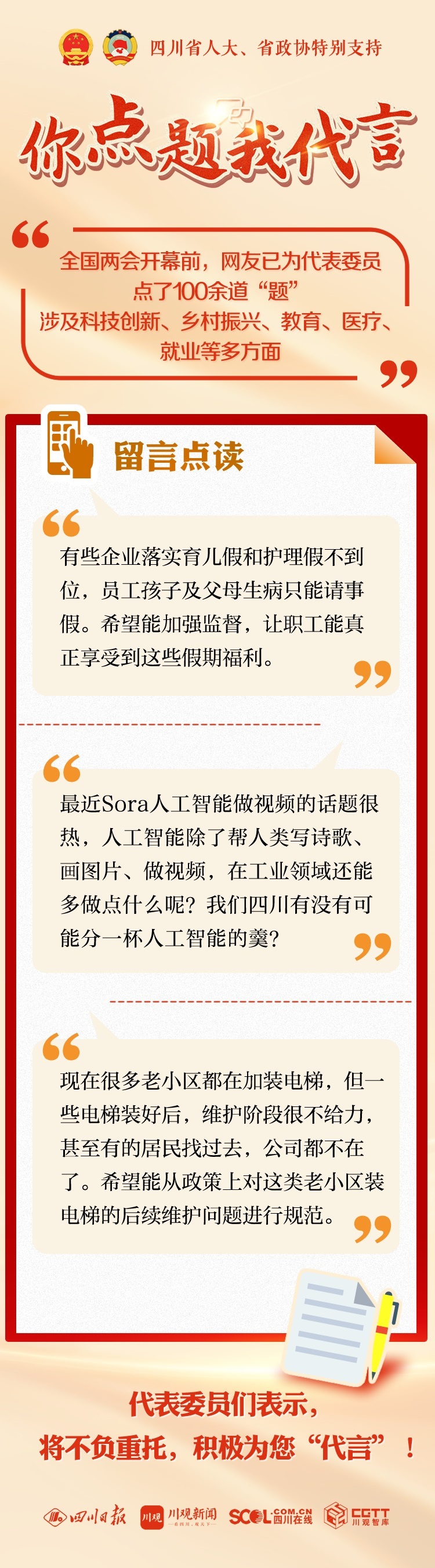 2024年全国两会在即,你最关注的热点话题是什么?对民生改善还有哪些期许?对经济社会发展又有什么好建议?3月1日,四川日报全媒体推出了“你点题我代言——四川日报全媒体邀你‘上两会’”互动活动,诚邀网友与参会的在川全国人大代表、住川全国政协委员们互动交流,共话民生,共促发展。