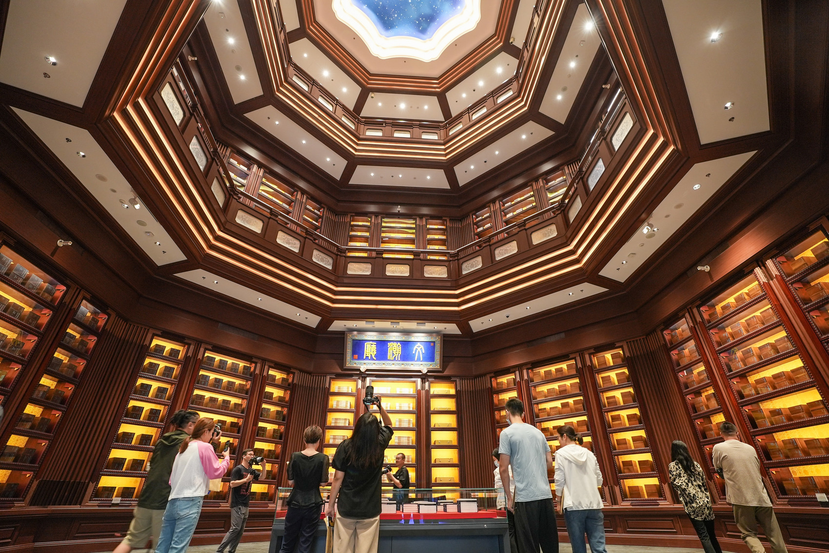 由文兴楼移步,一块篆刻着“赓续文脉”的寿山石印章前,坐落着这片建筑群的主建筑——文华堂。文华堂内,中央挑空两层高13米、面积1350平方米的国家书房让人眼前一亮——仰观穹顶,取自宋代石刻天文图的满天星宿点缀其中,寓意中华文明如星空般浩瀚璀璨;环视四周,15组书柜、3万余册古今经典汇成文山字海,彰显厚重文化底蕴。