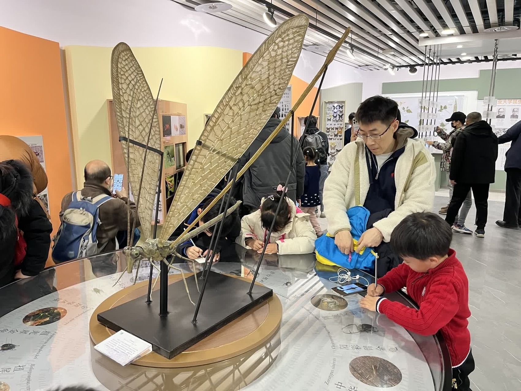 3月2日至3日,中国农业大学迎来新学期开放的首个周末,经过一个寒假的闭馆重整,该校昆虫博物馆开门迎客,两天参观人数超过1500人。“展厅内的明星展品是这只中华旌蛉,它是我国著名昆虫分类学家杨集昆在云南怒江首次发现的。”3日10时许,首场志愿讲解开讲,观众围在昆虫模型周围,听得津津有味。该馆志愿服务团团长杨皓然俯身,向小观众提问:“这个足有一米高的模型是三维打印技术生成的,你们猜它的昆虫原型有多大?”问题抛出后,大家纷纷猜答案。杨皓然向其中一位观众的本上盖了一个昆虫章,笑着揭秘:“你猜对了,一只中华旌蛉长度只有3厘米左右,大约是成人大拇指的一半长。”