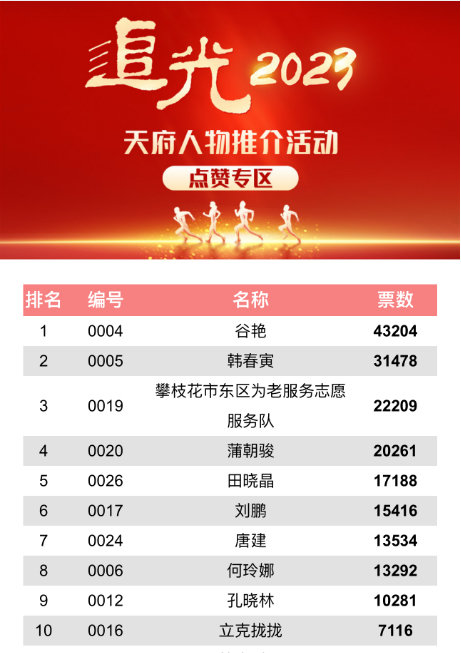 截至3月5日18时,追光2023·天府人物推介系列点赞排名前10位。