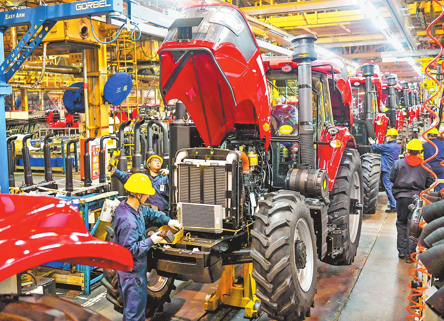 2023年12月4日,河南洛阳中国一拖大拖公司总装线上,工人正在装配一批出口欧洲的拖拉机。张怡熙 摄