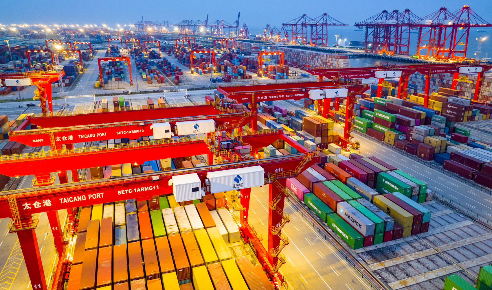 2023年7月1日,江苏苏州港太仓港区集装箱码头灯火通明,码头作业一派繁忙。计海新 摄 视觉江苏网供图