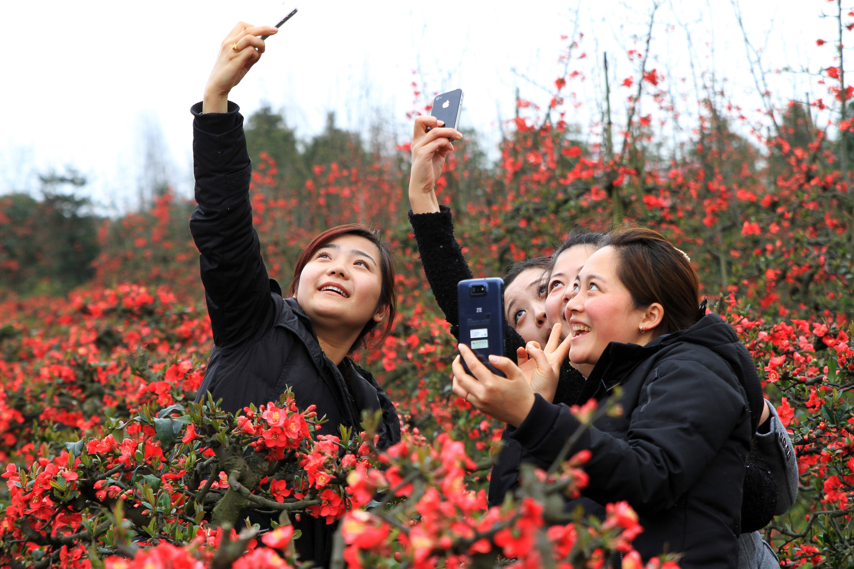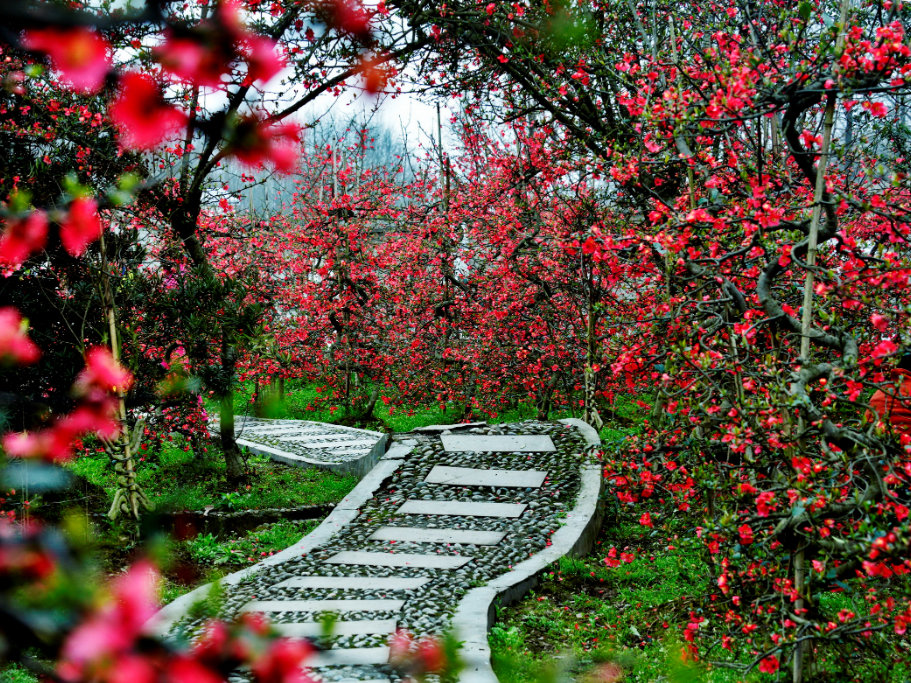 3月6日,都江堰市青城山镇泊江社区海棠公园,一片姹紫嫣红的花海呈现——近千亩海棠花次第开放,引来许多游客观赏。