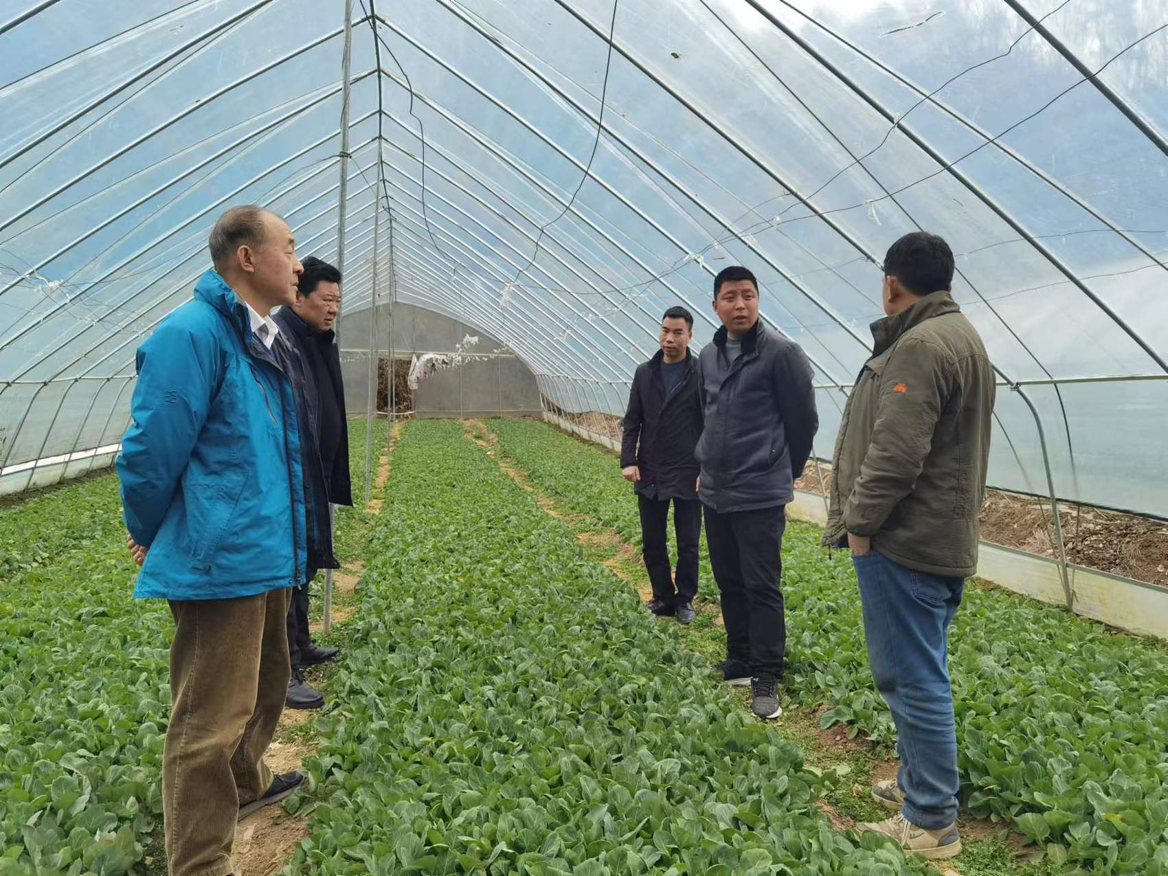 苗明军(右二)正在蔬菜大棚里了解牛心甘蓝秧苗长势。受访者供图