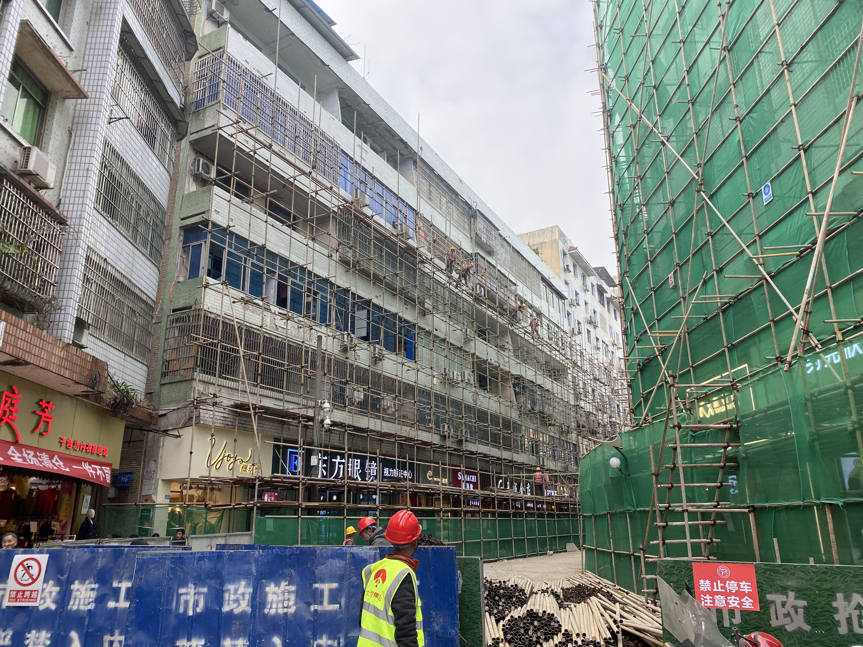 3月7日,在广安区城北北街北入口处,步行街两侧已搭建起高约6层楼的脚手架,并围上了绿色的建筑安全防护网,20余名工人正在进行外墙作业。