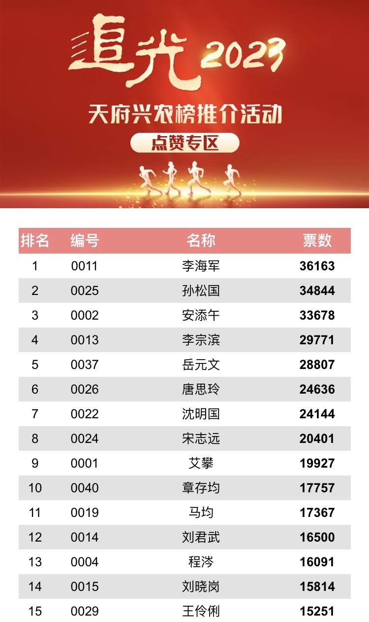 3月7日是“追光2023·天府兴农榜”人物推介活动第7个点赞投票日,截至3月7日15时,兴农榜总点赞数已超40万,前3位候选人总票数已突破10万点赞,大家投票热情高涨,候选人之间竞争日趋激烈。