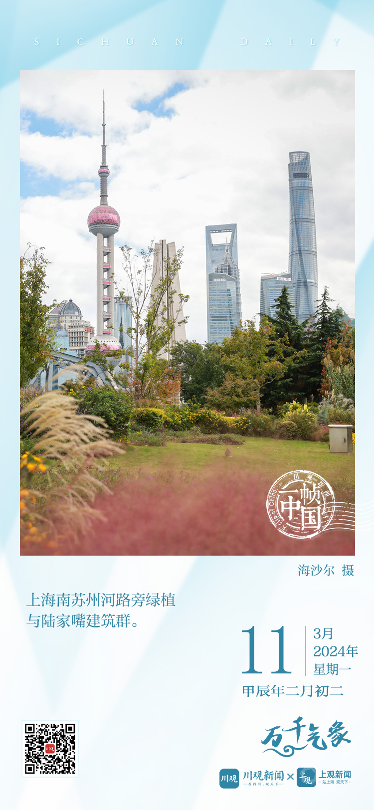 今天的《一帧中国》,川观新闻联合上观新闻,带您来到上海,从南苏州路视角遥看陆家嘴建筑群。