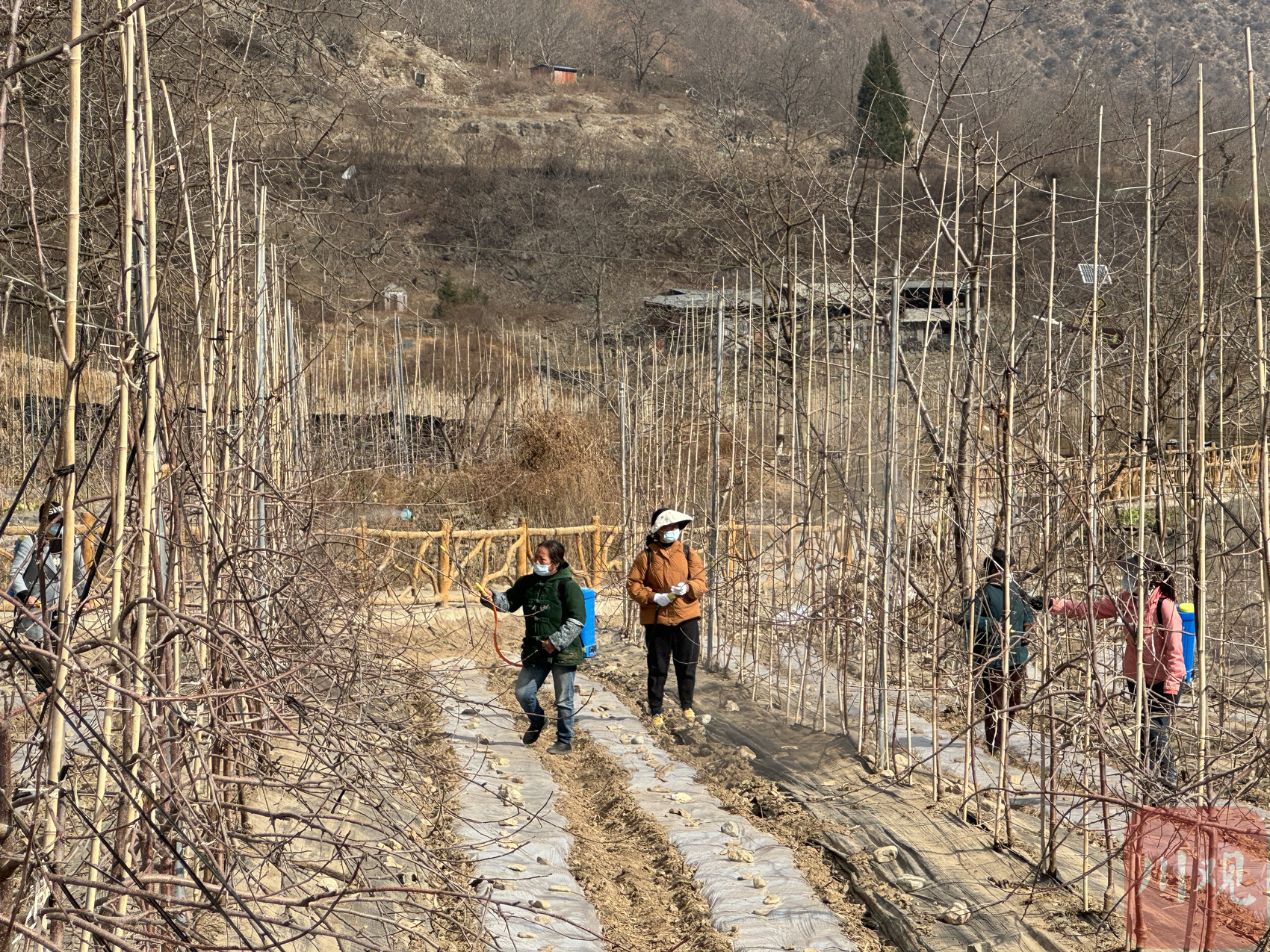 村民们在苹果园里喷药