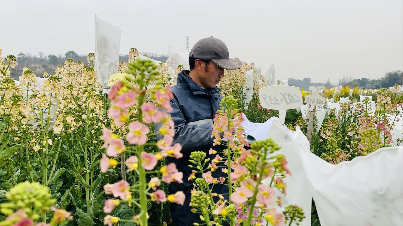 3月8日,崔成骑着一辆小电动车,在位于成都市新都区的四川省农业科学院(下称“省农科院”)现代农业科技创新示范园“七拐八绕”,骑进插满材料编号标签的油菜田,开始挑选优质油菜植株。