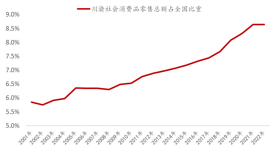 川渝两地社会消费品零售总额占全国比重 资料来源:WIND