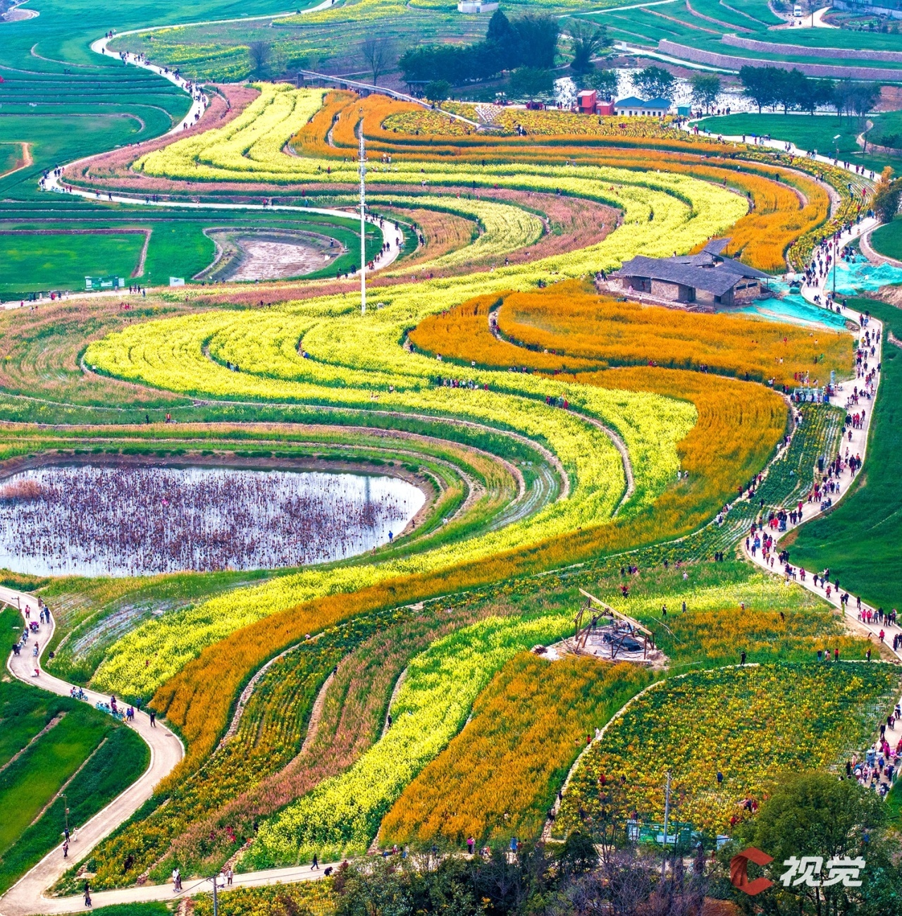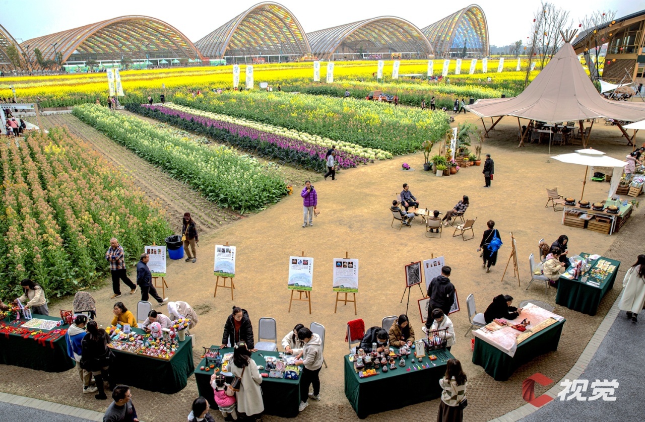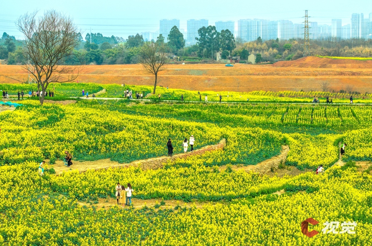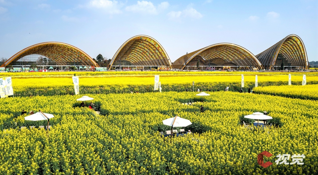 阳春三月,成都市新津区天府农博园内的油菜花次第盛开,黄色、粉色、橙色等五彩的花朵在风中摇曳生姿,宛如给大地披上了彩色“地毯”。游客除了赏花拍照,还能在花田里品茗、逛集市,享受惬意的春日时光。