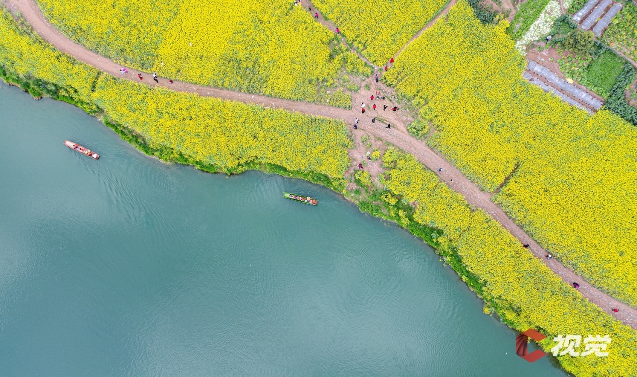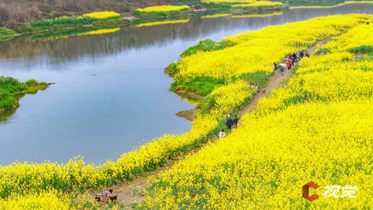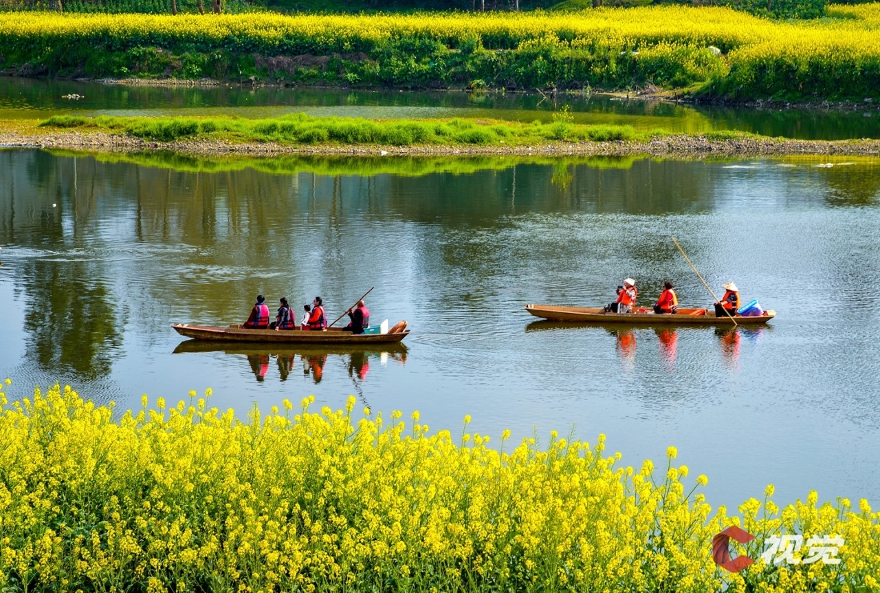 成都邛崃市的两河口,长达4公里的河岸线两边,错落地分布着大大小小上千亩的油菜花田。春风送暖,万花齐放,这里变身为金色的油菜花海。山水相映,游人如织,泛舟河上,如诗如画的场景吸引众多游客前来游玩。