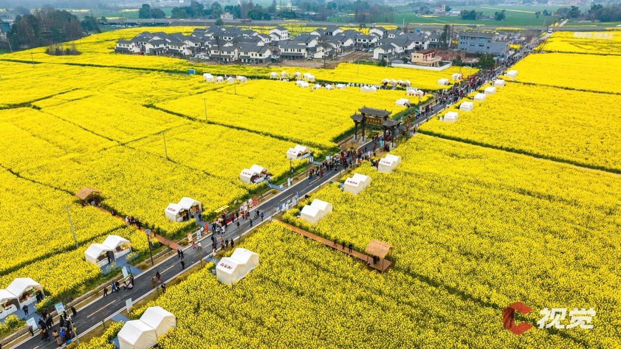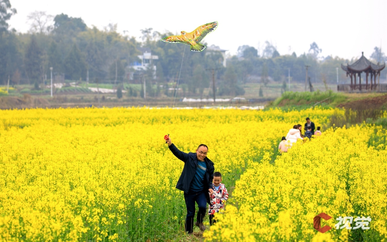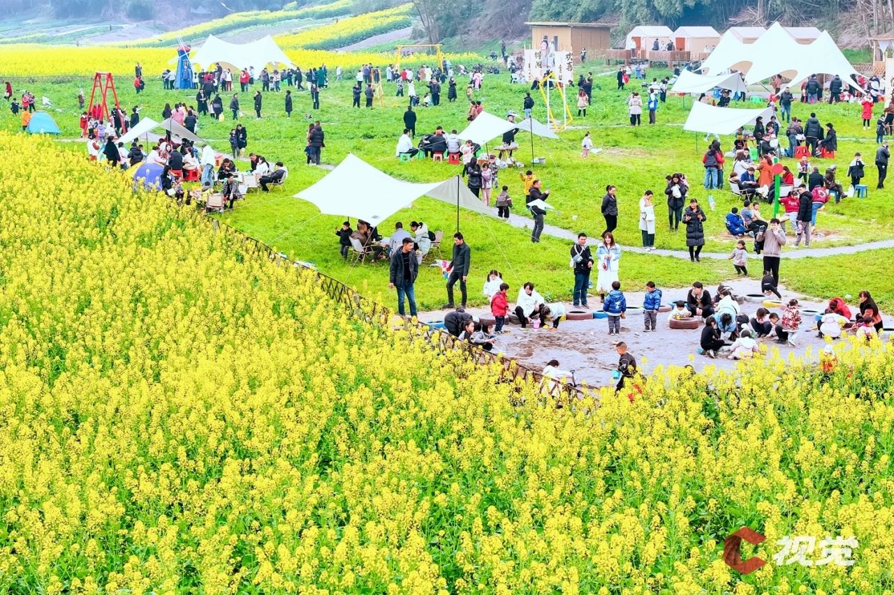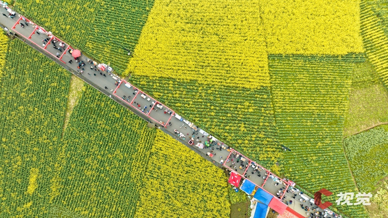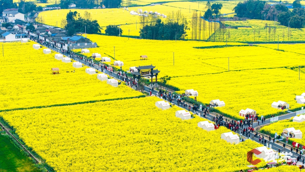 走进广安市广安区花桥镇万亩油菜园区,相继绽放的油菜花与民居、山峦、河流等相映成景,构成一幅幅生机盎然的春日画卷。市民游客在花田间漫步游玩,体验“乡村赶集”。