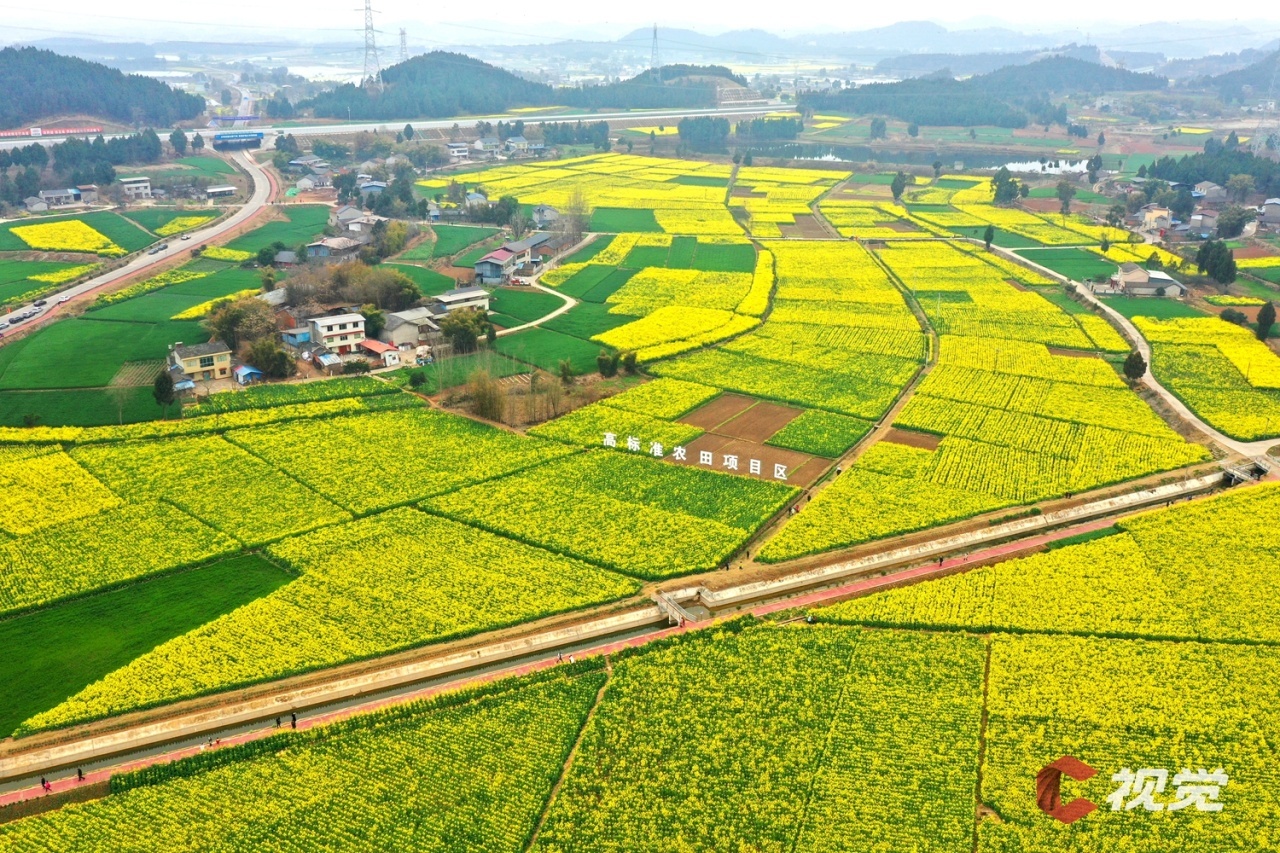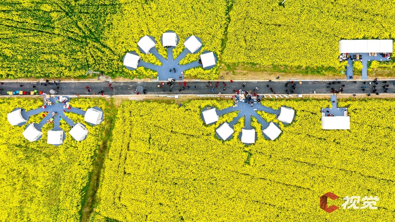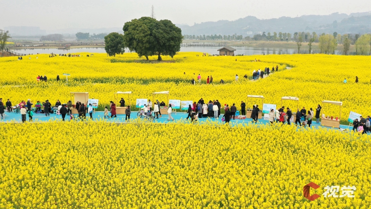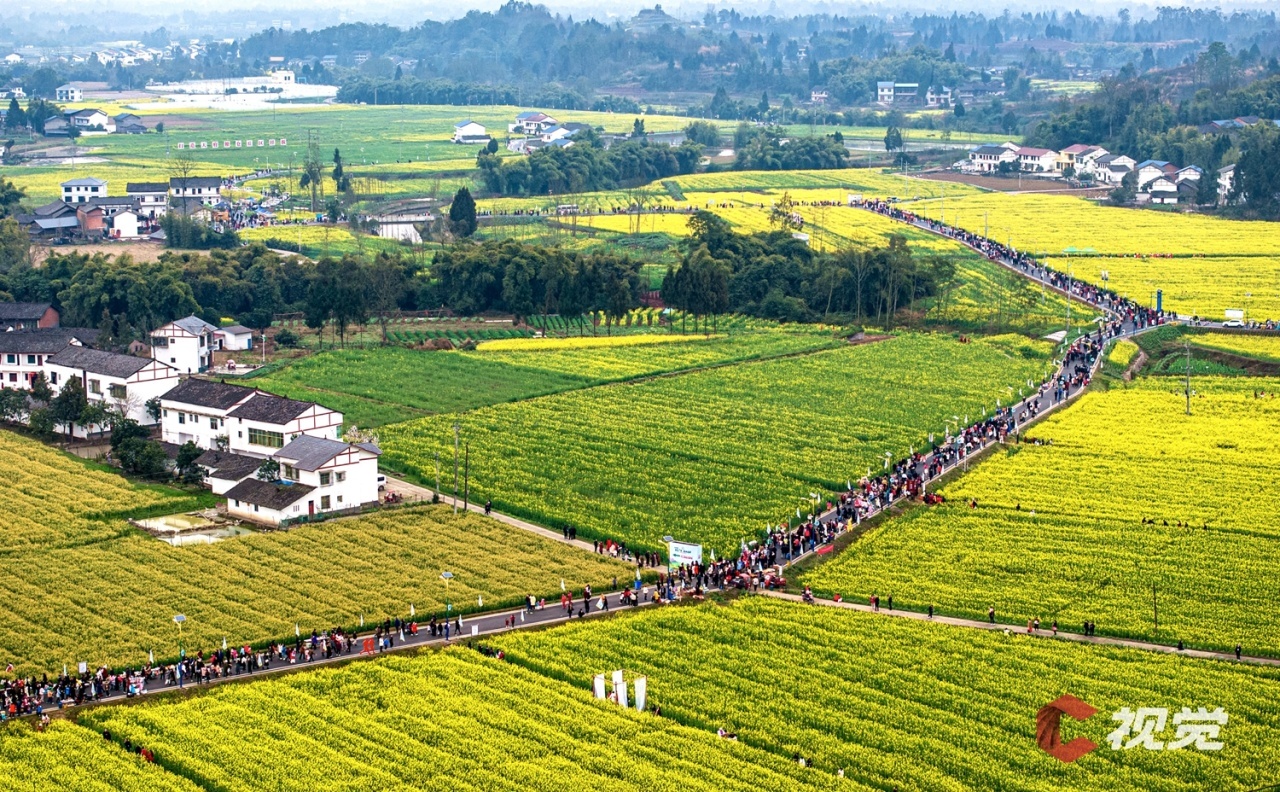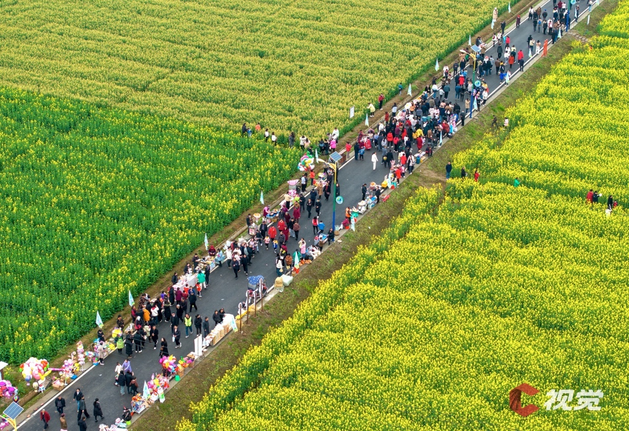 走进广安市广安区花桥镇万亩油菜园区,相继绽放的油菜花与民居、山峦、河流等相映成景,构成一幅幅生机盎然的春日画卷。市民游客在花田间漫步游玩,体验“乡村赶集”。